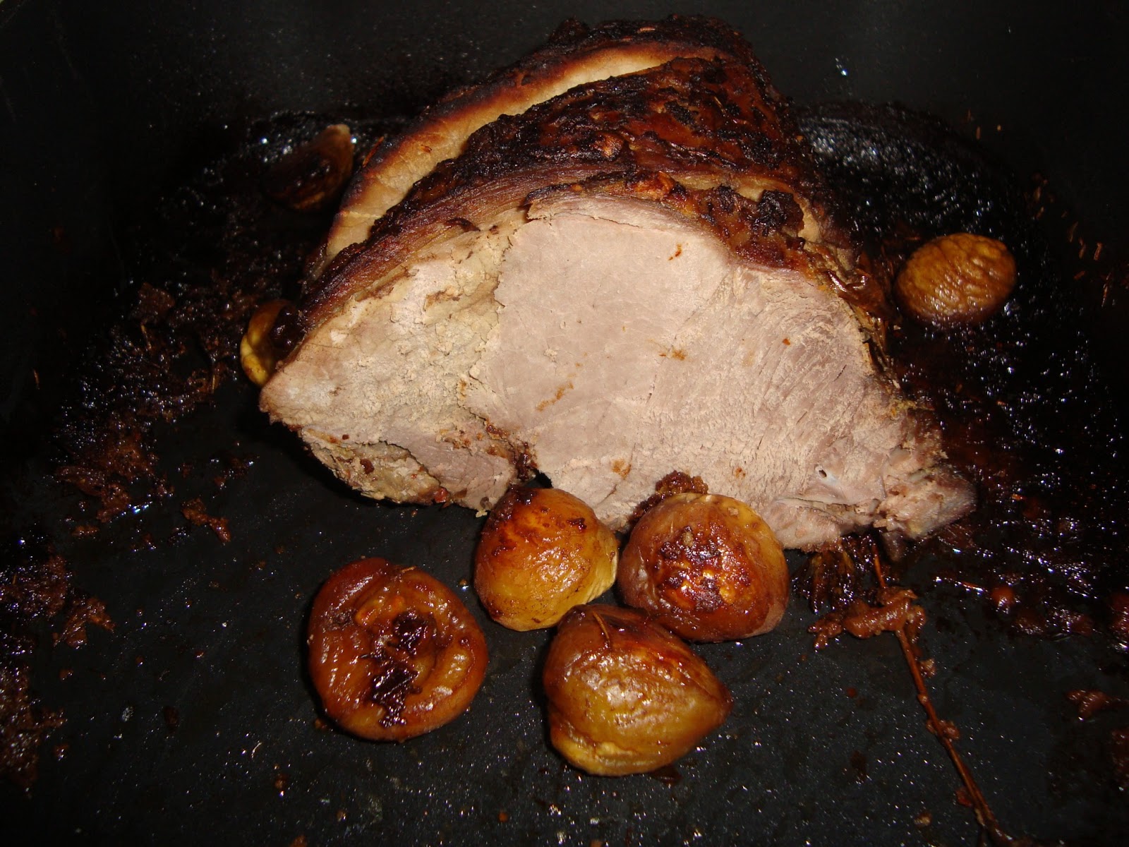 Coloque a carne no tabuleiro, com a marinada e as castanhas e
